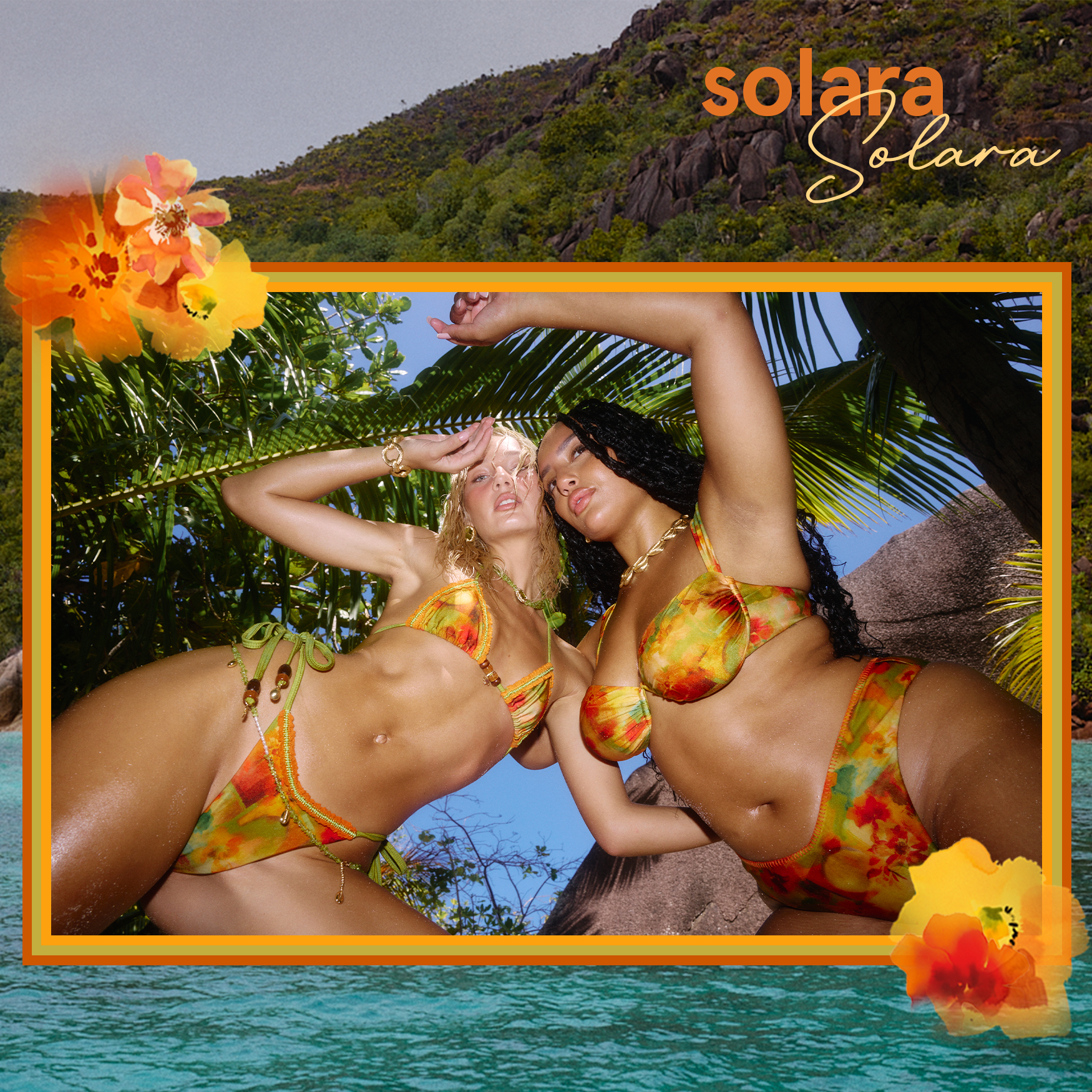 Solara’s gentle painterly palette of sunlit oranges and soft greens melts together like a fading sunset, evoking the magic of twilight swims, barefoot summer strolls, and salt-kissed air.
