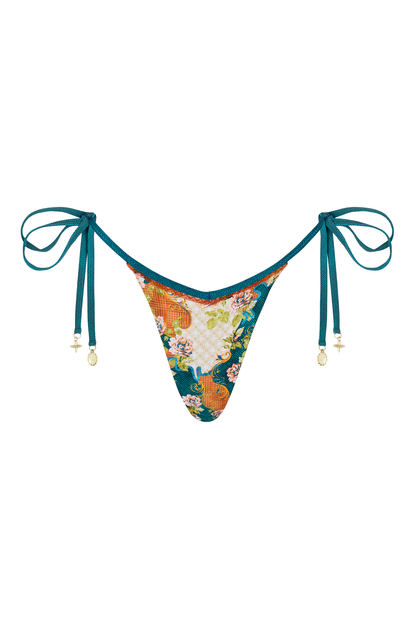 I love both the base print and the print on the strings - the Antigua color palette was perfect for my trip to Rio and to the Mediterranean. The little orange lace trim and the gold/opal pendants are exactly the pretty finishing touches I love from Bydee. I only wish the crotch length was an inch or so longer for the cut to be slightly more high waisted/ have higher rise. Even still, I love the fit - skimpy and perfect for tanning!