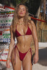 This stylish halter-style triangle bikini top features adjustable triangle cups and a supportive tie-back closure. It is beautifully accented with brown and orange lustrous resin beads finished with a textured gold bead that accent the top right-hand side of the cup and end ties. Completing the look is a textured gold zinc-alloy sunray charm and the Bydee plaque. This red bikini top pairs perfectly with the Sienna Bottom or any of our bikini bottoms from the Ámbar range.