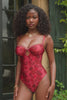 The Tulum high cut one piece in Rose features an underwire design with moderate coverage. The mid-high cut leg creates a flattering, elongating effect. Inner cup edges are overlaid with delicate baby pink lace trim, featuring a ribbon-like detail threaded through in deep red. The inner cups are accented with deep red lace trim for a romantic finish. This red one piece includes an adjustable tie-back closure for a customisable fit. Style as a swimsuit or bodysuit.